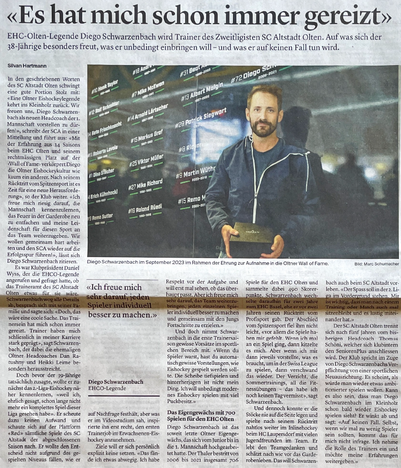 Der neue Trainer der 1. Mannschaft, Diego Schwarzenbach, hat im Oltner Tagblatt Auskunft zum Engagement beim SC Altstadt gegeben. Hier geht es direkt zum Artikel (kostenpflichtig).